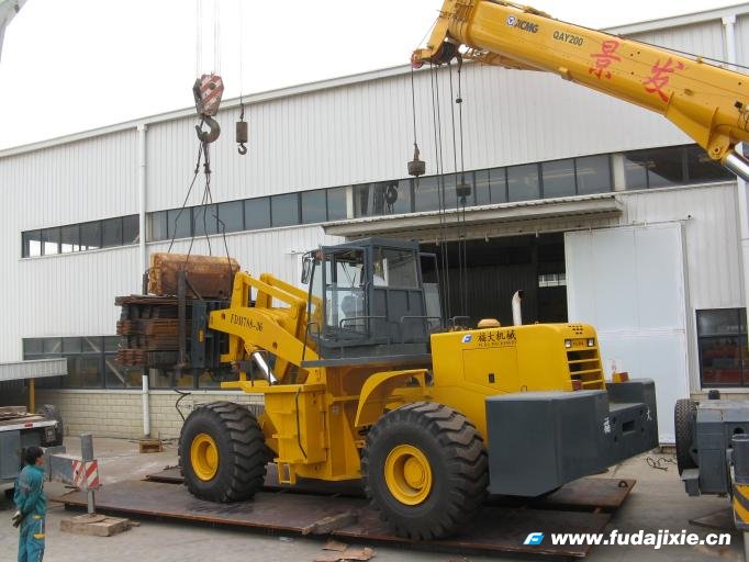 FDM788T-36(36噸)叉裝車是在8噸裝載機基礎上,結合叉裝車功能改進的,自重加載荷達75噸,由于體積大、質(zhì)量重,性能試驗中的穩(wěn)定性、牽引性能、提升能力等關鍵項目試驗的難度高,試驗組人員提前一個多月時間與公司技術人員溝通,做好試驗前的準備工作,確定了試驗方案。用7天時間完成了國家質(zhì)檢總局規(guī)定的型式試驗性能的試驗,并幫助企業(yè)一起分析解決試驗中發(fā)現(xiàn)的問題。
